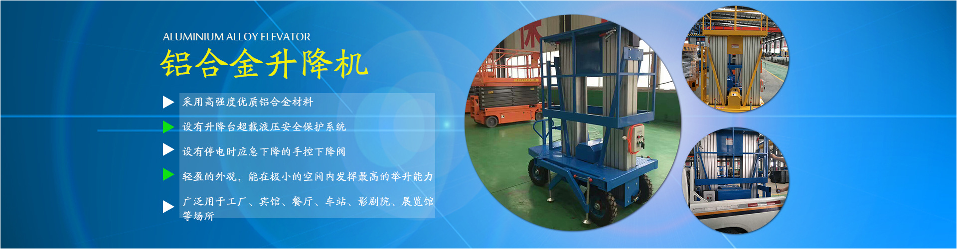 公司主要經(jīng)營(yíng):液壓貨梯、升降平臺(tái)、搬運(yùn)車、叉車及各種液壓設(shè)備等。并承接升降平臺(tái)出租業(yè)務(wù)。 產(chǎn)品廣泛用于:港口、電力、鋼鐵、造船、石油化工、礦山...